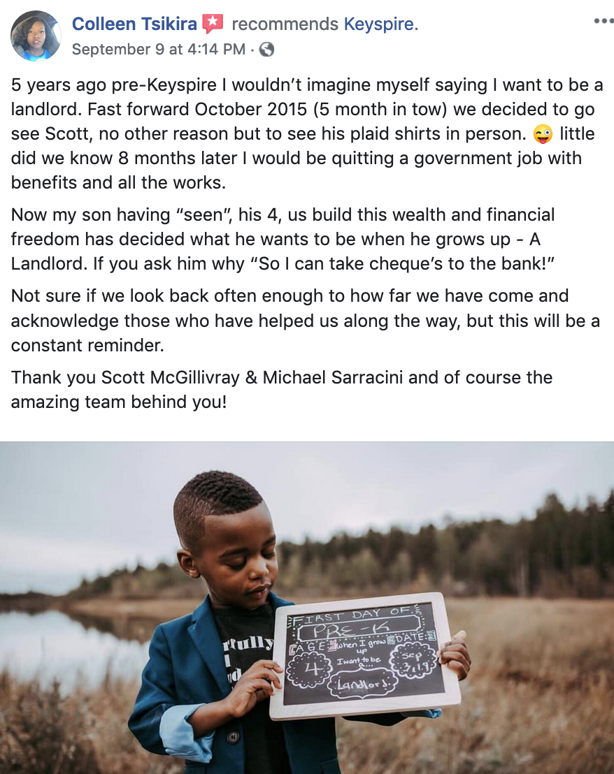 It all started from taking Michael Sarracini and Rae Ostrander’s three day Keyspire Workshop, so many ideas, tools and strategies filled my head. Learning how to be in my “Performance Zone” is a truly amazing feeling. From the workshop, I implemented at least five of the many strategies I learned in the first year. I can honestly say that for the first time, my investments are truly working as hard as I am. My “why”, to retire sooner rather than later and help as many people I can along the way, will be realized way sooner than expected.Thank you, Keyspire! I owe everyone a huge thanks!